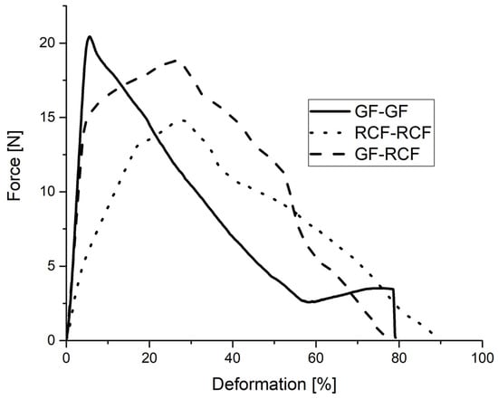 - The interaction of the two fiber types, GF and RCF, embedded side by side in a PP matrix can be demonstrated by fiber pull-outs. Due to the properties of GF in a hybrid reinforced PP+RCF-GF sample, the force/deformation curve increases steeply and reaches a higher force maximum compared to the RCF reference sample. The toughness of the RCF in the hybrid reinforced specimen results in the force maximum being reached at a high deformation, thus combining the properties of both fiber types.