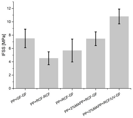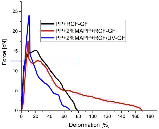 - As already shown in the single fiber pull-outs, a treatment of the RCF with UV light leads to stronger bonding of the fiber in combination with a coupling agent. The UV treatment of the RCF results in the formation of free radicals on the surface of the fiber, which bond with the coupling agent. This results in a stronger bond of the RCF to the PP compared to the PP and the adhesion promoter. The particularly strong bonding of the RCF leads to an increase in the maximum force in the force/deformation curves and, respectively, to a higher IFSS. Due to the strong bonding, the toughness of the RCF in the force–deformation curves is also lost after UV treatment, and the maximum force is already reached after small deformations.