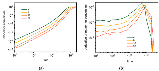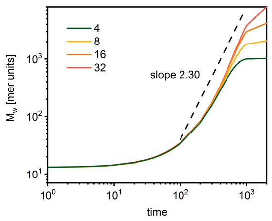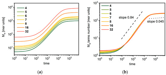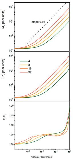 Figure 5 shows the number-averaged mass Mw, the weight-averaged mass Pw and the dispersity Pw/Mw for the star-branched systems under consideration in a log–log plot. After a short initial period, where the consumption of the monomer is low and stable, the increase is almost linearly proportional to the monomer conversion in a log–log scale. It was shown that in real experiments (ATRP polymerization), this dependency is the same [78]. The dispersity increases in the initial period, and the more arms the stars have, the lower the dispersity is. In general, the star-branched macromolecules with well-defined cores exhibit very small dispersion (below 1.07).