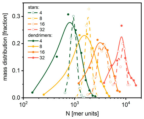 In order to obtain insight into details of dispersity values in both discussed cases, total mass distributions must be examined. Figure 7 presents the polymer mass distributions of macromolecules at the end of the polymerization process for all systems under consideration fitted with a Gaussian function. One can see that, in spite of small differences in the dispersity of stars and dendrimers (Figure 5 and Figure 6), the distributions of mass for dendrimers are considerably broader. For stars, the width of the distribution is almost constant, while for dendrimers it decreases when the number of macromolecules increases.