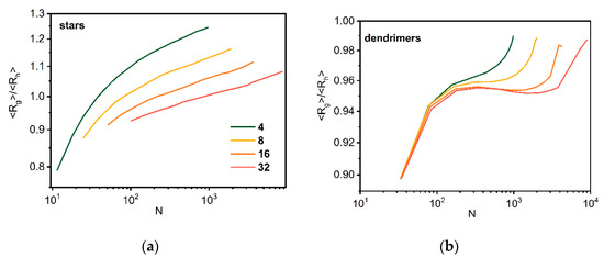 The radius of gyration and hydrodynamic radius were calculated for both architectures studied according to Equations (4) and (5). The < Rg >/< Rh > ratios for both stars and dendrimers are presented in Figure 8. The results clearly reflect this ratio for stars, i.e., the ratio decreases with the number of arms, although it differs from the experimental data [79]. For small dendrimers, the ratio does not depend on the number of macromolecules in the system, while for larger ones it diverges.