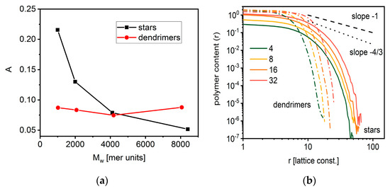 where λi are the components of the squared radius of gyration along the principal axes of inertia [80]. Figure 9a presents the mean asphericity factor A determined according to Equation (6). The shape of stars becomes more spherical when the number of arms increases, which is consistent with other findings [2]. In the case of dendrimers, there is a minimum on the curve, which was already found by experiments [40]. Polymer density profiles for both architectures are presented in Figure 9b. Polymer density decreases very slowly, which suggests the presence of a dense core and a rapid decrease for longer distances. In their theoretical considerations, Daoud and Cotton [81] predicted two regimes inside stars: an unswollen one with slope −1 and a swollen one with slope −4/3. One can conclude that it is impossible to localize the regions with such slopes on our curves.