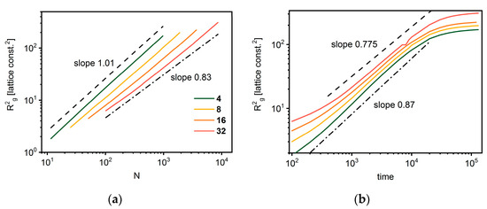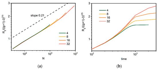 Figure 10 shows the changes in the mean-squared radius of gyration as a function of star mass and time. A scaling behavior of < Rg2 > was found not to be related to the number of arms. The exponent 2ν decreases from 1.01 to 0.83, as the number of arms increases, which means that the fractal dimension becomes higher (from 1.98 to 2.41) with the number of arms. The exponent 2ν from Equation (7) for dense polymer melts is expected to be close to 1 [82], while lower values are predicted for dense collapsed structures. The size growth exponent is similar for all investigated numbers of arms.