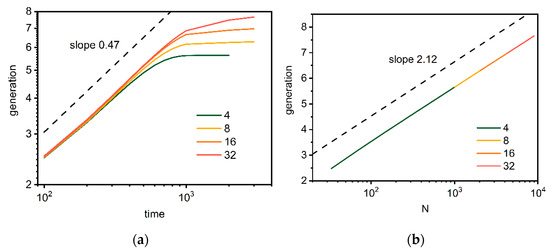 Figure 11 shows the changes in the number of generations g calculated according to Equation (10) as a function of time of synthesis and the total mass of a macromolecules. In the initial period, the estimated number of generations does not depend on the number of growing macromolecules. Moreover, it is clear that the increased scales with time and the scaling exponent are found to be close to 0.47. Then, well below 103 Monte Carlo steps, g clearly depends on the number of cores (macromolecules) in the system. At the lowest initiator concentration (the smallest number of cores), almost 8 generation dendrimers were achieved, while for the highest number of cores, the number of generations does not exceed 6 (one must remember that the polymers studied are not the same length and the mean number of generations is studied here). The dependence of the number of generations on the total dendrimer mass is presented in Figure 11, showing no differences in the investigated cases.