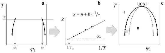 Figure 1 shows a scheme of the methodology for the thermodynamic analysis of binary polymer systems and the construction of generalized phase diagrams. At the initial stage, fragments of binodal curves are plotted based on the experimentally obtained data on the solubility of polymers in each other (Figure 1a). Then, according to the compositions of the coexisting phases φ 1 and φ 1 at different temperatures T, using Equation (9), the numerical values of the pair interaction parameter χ are calculated, and its temperature dependence is plotted (Figure 1b). Extrapolation of this dependence to χ c r makes it possible to obtain information about the critical solution temperature of the components (in this case, the upper critical solution temperature — UCST). In coordinates χ = A + B · 1 T it is possible to identify χ data in a wide range of temperatures at TTexTTex, T ≥ USCT. Based on these data, using Equations (5) and (6), the boundary spinodal (dashed line) and binodal (solid line) curves are calculated, and a generalized phase diagram is constructed (Figure 1c) in the selected temperature range, which traditionally denotes the region of homogeneous states (I), the region of labile structures (II), and the region of metastable states (III).
