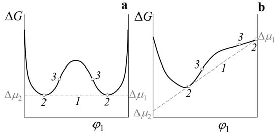 We should consider in more detail the procedure for determining data on the coexisting phase compositions. It is known that the concentration dependence of free energy for a polymer–polymer system at a temperature T ≤ UCST, corresponding to the limited mixing of components, is a complex curve with two minima and two inflection points (Figure 2a). By drawing a common tangent to the dependence Δ G φ , corresponding to the equality of chemical potentials, it can determine the concentrations at the points of the curves contact (points 2) about thus assess the information about the coexisting phases compositions for the binodal curve ( φ b and φ b ), and in inflection points (points 3) receive information for constructing a spinodal curve ( φ c and φ c ). Numerical determination of binodal and spinodal concentrations of more or less symmetric concentration dependences of the free mixing energy does not cause any difficulties [18]. This situation is realized in cases where the molecular weights of the components do not differ much. When analyzing a similar dependence for a binary system with significantly different molecular weights of components—for example, a polymer solution, a polymer–plasticizer mixture, a polymer–oligomer system, and even a high-molecular polymer–low-molecular polymer blend—significant difficulties arise in the standard approach. It can be seen (Figure 2b) that in this case the dependence Δ G m ( φ ) becomes sharply asymmetric, one of the binodal concentrations shifts to the region of small values, the curve flattens out in this place, which greatly complicates the numerical determination of the phase composition. In this case, the direct mathematical solution of the system of Equation (6) leads to a multiplicity of solutions that are difficult to automatically limit.