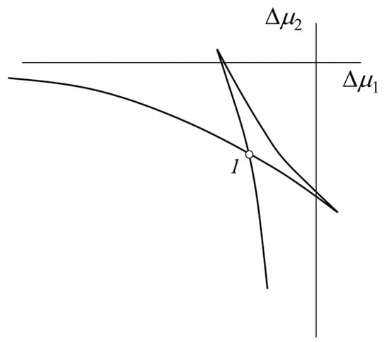 Analyzing the principle of equality of chemical potentials in different phases and its interpretation as a common tangent to the dependence Δ G m ( φ ) , we can assume that there are the same values at two points of the concentration dependences of chemical potentials. This means that the dependence Δ μ 2 ( Δ μ 1 ) must have a self-intersection point (two points of the dependence must have the same value). For a single-phase system, this dependence has no self-intersection points, and for a two-phase system, it has a single point corresponding to the equality of chemical potentials in different phases, i.e., thermodynamic condition of phase equilibrium. Figure 3 shows such a schematic concentration dependence of chemical potentials where the values of Δ μ 1 and Δ μ 2 correspond to the same value of the concentration of the components. Therefore, the enumeration of concentrations in the range from 0 to 1 gives a set of pairs of chemical potentials for this dependence. The point of self-intersection (1) determines, in this case, the concentrations of the binodal curve.