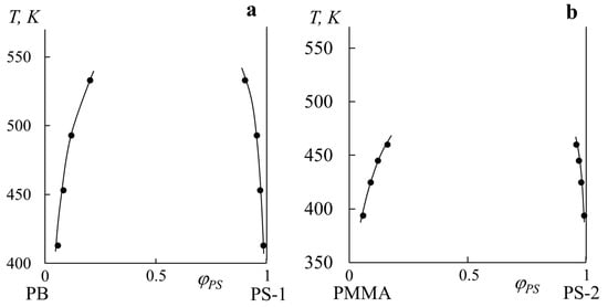 According to the method proposed above, using Equation (9), pair interaction parameters were calculated, and their temperature dependences were plotted (Figure 5). It can be seen that both systems demonstrate a linear change χ in the proposed coordinates, and interpolation of such a dependence is possible in the form χ = 3.4748 · ( 1 / T ) 0.0022 for the PB–PS-1 system and χ = 142.78 · ( 1 / T ) 0.1608 for the PMMA–PS-2 system. Such interpolation allows us to extrapolate data to a wide temperature range and obtain, firstly, information about the critical temperature from the intersection of the dependence χ ( 1 / T ) and the calculated value χ c r (as shown schematically in Figure 1b). In accordance with this, the UCST for the PB–PS-1 system is 628 K, and for the PMMA–PS-2 system, it is 598 K. The calculated values for the concentrations at the critical point φ P S ,   c r by Equation (3) can be given as 0.64 and 0.91 for each of the systems, respectively. Second, extrapolation of the temperature dependence of the interaction parameter enables us to use data on the χ ( 1 / T ) ratio to determine the corresponding compositions of coexisting phases with any temperature step. The phase equilibrium data for the PMMA-PS system and the temperature dependence of the interaction parameter are in good agreement with the data obtained by the turbidity point method for this system [24,25], taking into account the difference in the PMMA molecular weight.