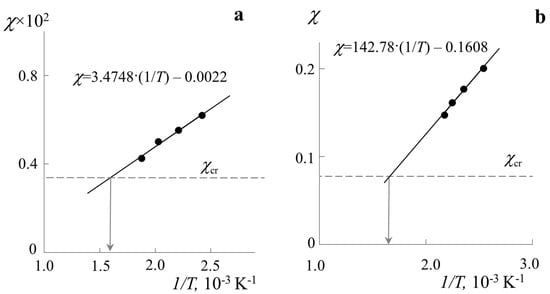 Determine the position of the critical point on the phase diagram based on the calculated value of the concentration at the critical point according to Equation (3) and the critical temperature according to the point of intersection of the temperature dependence χ and the calculated value χ c r according to Equation (4) (as shown in Figure 1b).