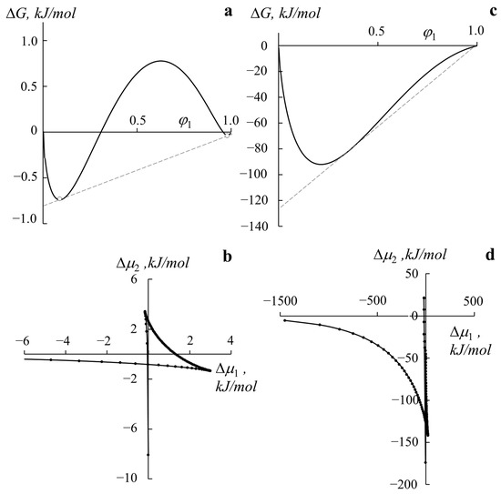 Figure 6 shows the calculated data on the free energy of mixing and chemical potentials in the studied systems. It can be seen that the PB–PS-1 system is characterized by a more symmetrical concentration dependence for Δ G (Figure 6a). The extrema of the function is explicitly defined both for the case φ P S 0 and for the case φ P S 1 . For the PMMA–PS-2 system (Figure 6c) for φ P S   ~   0.2 , the first extremum of such a dependence is uniquely determined, and the localization of the second extremum at φ P S 1 cannot be determined. When passing to the concentration dependences of chemical potentials (Figure 6b,d), according to the proposed method, in both cases, we can identify the self-intersection point and determine the corresponding compositions of the coexisting phases for the binodal curves.