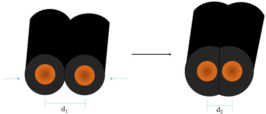Schematic cross-section of carbon-filled, silicone-coated metal yarn and their deformation upon strain that causes the change in electrical resistance.