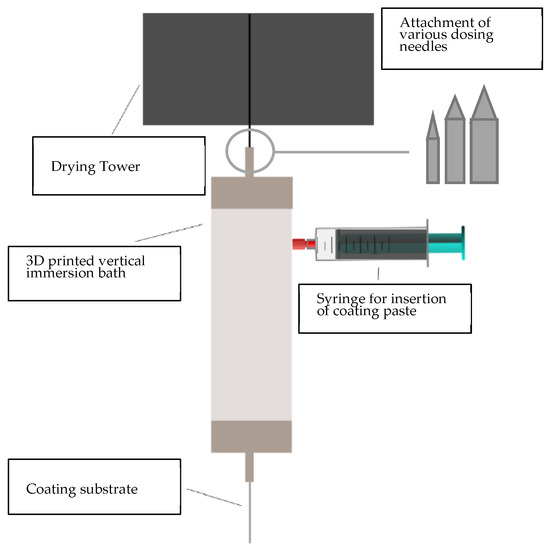 The coating process is based on vertical dip-coating technology. A similar coating set-up has been previously published [43]. Herein, a 3D-printed immersion bath was deployed in the yarn drying tower FMP-Ditro 3D from FMP Technology GmbH (Erlangen, Germany). Dosing needles can be attached to the immersion bath, so that different outlet openings, depending on the substrate, can be realized. In this coating set-up, a dosing needle with a diameter of 1.12 mm (supplier VIEWEG GmbH, Kranzberg, Germany) was chosen for all substrates. Figure 2 shows the schematic drawing of the coating set-up. The substrate is unwound vertically and passes through the coating bath, while coating paste is injected. When exiting the coating bath, it directly enters the drying tower; at its exit, the substrate gets redirected and finally wound up by a winding unit with adjustable winding speed. The process parameters were set at a 165 °C drying temperature and a process speed of 0.2 m/min. The drying tower has a height of 2.0 m, so that the substrate remained for 10 min in the drying section.
