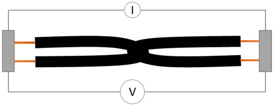 The electrical properties of the samples were examined by measuring the surface electrical resistance applying a four-point-probe method (Figure 3). Compared to the traditional, two-point sensing method, the four-point-probe method uses separate pairs of current-carrying and voltage-sensing electrodes to improve accuracy, as contact resistance can be compensated for [44]. The device used was a Resistomat 2316 with the clamping device type 2381 (Burster Präzisionsmesstechnik GmbH & Co. Kg, Gernsbach, Germany). Calculations of the theoretical electrical resistance are omitted for the following reasons: textiles in general, which comprise yarns as well as fabrics, are inhomogeneous and anisotropic products. Therefore, the electrical properties vary depending on the raw material, its structure, and geometrical dimensions. The anisotropy of flat textile materials has been described in many articles [45,46,47], but the same observations also hold true for yarn-based, electrical conductive textiles. The used yarns are made of single silver, copper-coated filaments, or steel filaments that are twisted with each other. Thereby, not only the coating of the individual filaments is irregular, but also the total cross-section of the yarns caused by the twisting. Consequently, the carbon-filled silicone coating is also applied inhomogeneously and not in a perfectly round manner. Theoretical calculations of the electrical resistance of those hybrid yarns, therefore, become difficult and the surface electrical resistance was obtained simply through measurements.