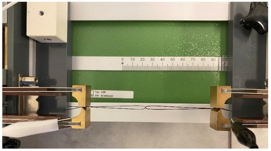 In order to measure the electrical resistance of the metal yarns under compressive loads, the test set-up of the measurement followed the standard “DIN 53843-1-Loop tensile test”. The loop tensile test provides that two sections of a specimen are intertwined and clamped so that the total length amounts to 100 mm. One clamp is then moved by one millimeter so that the specimen is stretched by 1% and thus loaded. Subsequently, the clamp is moved back to a length of 100 mm. Stretching and releasing of the sample corresponds to one cycle. The samples were prepared in such a way that the coating was removed from the ends, where the samples were clamped into the set-up. The electrical contacts were therefore on the metallic yarns, rather than on the coating. This ensures that the change of electrical resistance due to compression of the substrates caused by load is measured and not the changes of resistance on the surface of the coating. From those measurements, the factor of resistance change as well as the Gauge-factor were calculated. The real measurement set-up, consisting of the sliding clamping device and the interlooped structure of the sensory yarns, can be seen in Figure 4.