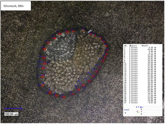From the cross-sectional samples in Section 3.2.2. one can approximately determine the layer thickness of the coating, which is shown here exemplarily in Figure 5. Measurement points from the outer coating to the outer edge of the yarn were set and the distance was measured by the software of the microscope. Calculating the mean from all measurement points, the layer thickness of the coated Silvertech yarn amounts to 26.60 µm.