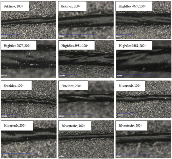 First examinations of the samples were carried out by light microscopy and provide information about the coating morphology. Figure 6 shows the longitudinal view on the samples at 100-times and 200-times magnification. It becomes clear that a uniform coating depended significantly on the metallic substrate’s material and structure. The coating covered the yarns while the textile character, especially the twisting, was still recognizable. As it is shown in the micrographs in Table 1, the Shieldex yarn was twisted most. Even after coating, this inherent structure was clearly identifiable. Also, the clear size difference between the Highflex 7077 and the Highflex 3981, compared to the other yarns, became visible.