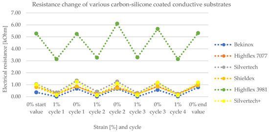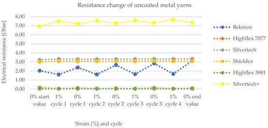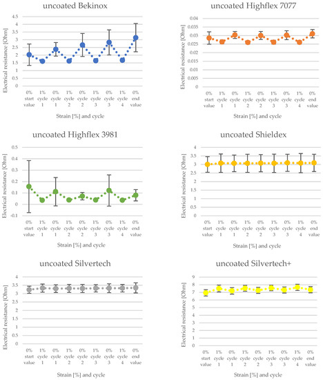 Figure 8 and Figure 9 show the change of electrical resistance upon four cycles of loading and unloading of all substrates, whereof Figure 8 includes the coated and Figure 9 the uncoated substrates tested with the same measurement set-up. In Figure 8, the carbon-silicone-coated Bekinox yarn shows the lowest and the coated Highflex 3981 yarn shows the highest electrical resistance values. The size range of all samples was comparable, though the Highflex 3981 had approximately 5 times higher resistance values than the other substrates. The Bekinox yarn initially showed an electrical resistance value of 0.3638 kOhm. When it was loaded about 1%, electrical resistance decreased to 0.0078 kOhm. For the Highflex 3981 yarn, values are as follows: the initial resistance lay at 5.2792 kOhm but, upon loading, it dropped down to 3.1372 kOhm. When comparing Figure 8 and Figure 9, it must be noted that for the uncoated samples the resistance values are given in Ohm. Thus, the coating increased the resistance approximately one-thousand-fold. However, the amplitudes of the change of electrical resistance upon loading of the uncoated samples were lower. Here, the Highflex 7077 had the lowest electrical resistance values, starting at 0.0286 Ohm and decreasing to 0.0263 Ohm upon loading. The Silvertech+ yarn had the highest value, given at 6.9318 Ohm, and increased upon loading, unlike all previous samples, to 7.0522 Ohm. The single displays of the measurements, including the standard deviation, are given in Figure 10 for the coated and in Figure 11 for the uncoated samples. For coated and uncoated substrates, it is observable that the values during loading were mostly more consistent over all cycles than the values during unloading. This becomes apparent when looking at the standard deviations in Figure 10 and Figure 11. For the coated Shieldex substrate exemplary, the standard deviation of unloading lies between 0.25 and 0.49, whereas the standard deviation of loading lies between 0.06 and 0.08. The effect of the coating regarding the sensitivity of the sensor becomes especially apparent when comparing the uncoated Shieldex, Silvertech, and Silvertech+ yarns to their coated equivalents. The uncoated substrates show nearly no change in electrical resistance when loaded or unloaded while the coated substrates triple to tenfold their values during the load cycles. The uncoated Bekinox, Highflex 7077, and Highflex 3981 already show sensor characteristics in their uncoated form, as the electrical resistance dropped during loading. Nevertheless, the sensitivity of the yarns towards loading can still be enhanced by the coating. The only exception is the Highflex 3981, which showed better sensor properties in the uncoated state.