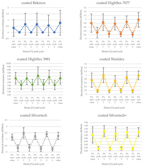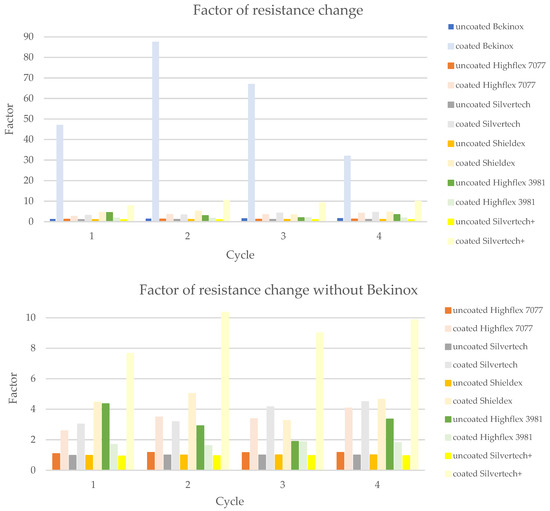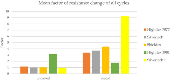 Figure 13 shows the calculated mean values of the factors measured during the different cycles, whereby the Bekinox sample is not depicted due to the described issue. In this simplified diagram, the increase of the factor becomes particularly apparent. The highest rise was recorded for the Silvertech+ samples, but Silvertech, Shieldex, and Highflex 7077 also show significant increases. The coating on the Highflex 3981, on the other hand, caused exactly the opposite: a decrease of the factor of resistance change was observed for the coated samples compared to their uncoated equivalents.