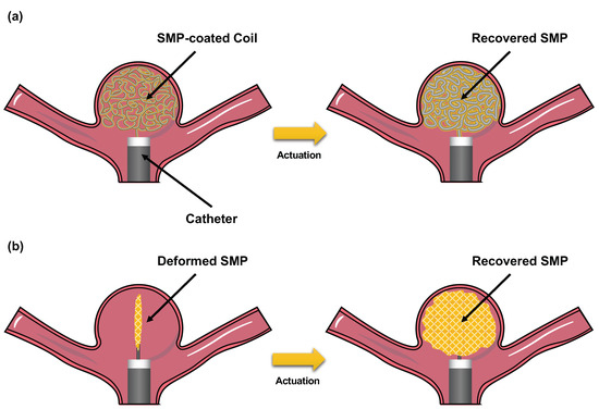 SMPs are the materials with the capacity to undergo thermo-mechanical changes in response to different stimuli. These polymer materials can be fabricated into a “home” configuration, where the material is rigid and not deformable. Then, by means of an external stimulus, the material can be deformed to a “stored” (also known as “reprogrammed”) configuration. With the second stimulus applied, the recovery of the material to their original geometry can be achieved. This unique feature poses great opportunities for designing responsive materials that enable personalized endovascular ICA treatment. For example, current endovascular devices, such as GDCs, can be improved by an SMP coating that occupies the gaps between coils (Figure 2a). Another potential approach can involve the fabrication of coil-free devices using patient-specific geometry to occlude the aneurysm after shape recovery (Figure 2b).