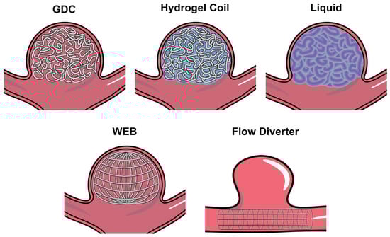 Endovascular devices for ICA treatment were first developed by Guglielmi et al. [14,15,16] in 1990, where soft and thin platinum wires, called Guglielmi detachable coils (GDCs), were wrapped inside the aneurysm sac to prevent the intra-aneurysmal blood flow (Figure 3). In addition, GDCs were designed with the capacity to induce thrombogenesis, a process where platelets accumulate on the surface of the coil using electrical stimuli. These devices revolutionized the treatment of ICAs due to their minimally invasive approach using catheter-guided delivery. Ever since their first introduction, they have been the gold standard for the treatment of saccular ICAs.
