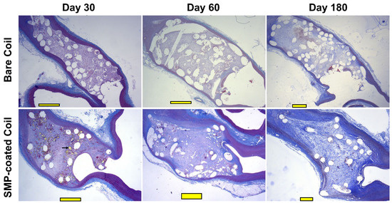 Histological analysis of embolized aneurysms with bare coils vs. SMP-coated coils in a rabbit model. Staining was performed using Masson’s Trichrome at different timepoints (30, 60 and 180 days post-implantation) in this pre-clinical study. Scale bars mm. (Images were adapted from Herting et al. [19] with permission of John Wiley & Sons).