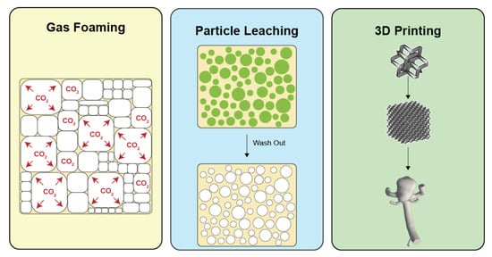 Traditional and coated GDCs, as well as the WEB device, are transported through a microcatheter and are coiled within the aneurysm. Currently, SMP-based endovascular devices are under development so that they can be utilized in a similar manner. SMP design for endovascular devices can follow two major approaches: (i) SMP-coated coils such as Trellix [19,46]; and (ii) coil-free SMPs foams [55,56,57,58]. SMP-coated coils have a similar goal to the hydrogel coils: increasing the packing density may augment the volume of the coil. On the other hand, coil-free SMPs aim to be fabricated with patient-specific aneurysm geometry to obtain complete occlusion. Both approaches require the high compressibility of the material, which can be achieved through pore formation. In this section, we will review some existing methods for the fabrication of highly porous SMPs.