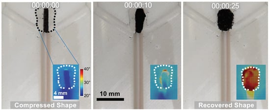 In our group, we developed conductive SMPs via CNT infiltration in sugar-leached polyurethane foams [56,58]. We demonstrated that CNTs are an effective and facile method for the shape recovery of the porous SMP foams. SMP/CNT foams emit heat when the direct current is applied, allowing the recovery of the compressed foam (Figure 6). However, we also observed that CNT infiltration reduced of the material and deteriorated its capacity to withstand cyclic deformation [58]. Other researchers have also found similar behaviors for CNT-infiltrated SMP composites [85,86].