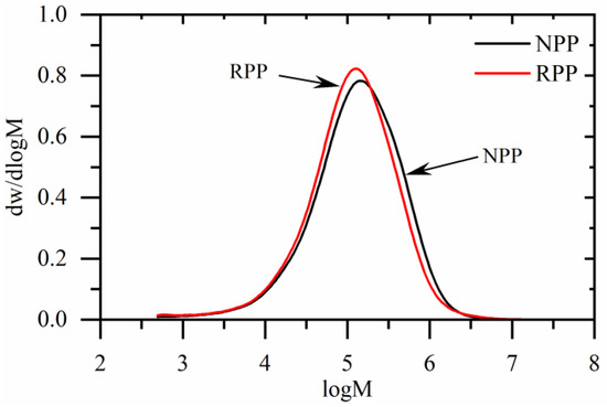 The molecular weight distribution of neat (NPP) and recycled (RPP) polypropylene matrix materials.