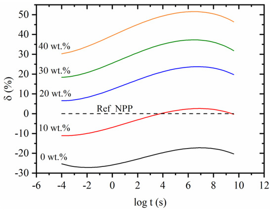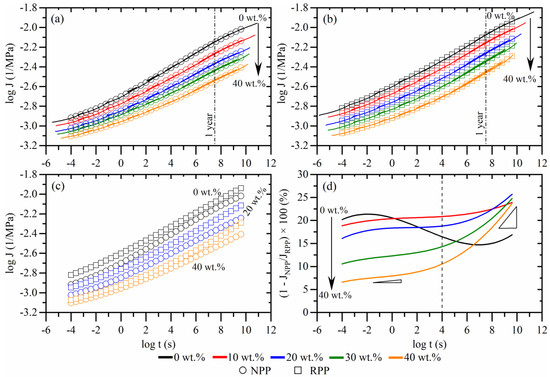 A direct comparison between creep compliance of composites with NPP and RPP matrix is shown in Figure 2c,d. For clarity, only the compliance of matrix materials (0 wt.%) and composites with 20 and 40 wt.% are shown in Figure 2c. The comparison shows that the creep compliance of composites with the RPP matrix is higher than composites with the NPP matrix at all concentrations. This is in line with the measured higher degree of crystallinity of composites with NPP matrix, as the higher crystallinity causes lower creep compliance [43,44].