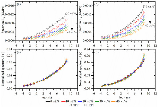 Retardation spectrum of composites with (a) neat (NPP) and (b) recycled (RPP) matrix. Normalized retardation spectrum of composites with (c) neat (NPP) and (d) recycled (RPP) matrix.