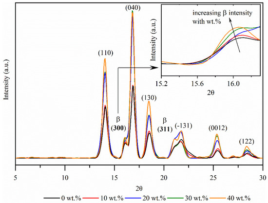 The X-ray diffraction patterns in the 2θ angle range of the NPP matrix composites as a function of wood fiber concentration are shown in Figure 5 at 14.04° (110), 16.07° (300), 16.78° (004), 18.53° (130), 21.08° (311), 21.70° (−131), 25.43° (0012), and 28.47° (006). In the diffraction pattern, peaks of the α-phase, β-phase, and γ-phase can be distinguished for all materials. The reflection peaks of composite materials at 14.04°, 16.78°, 18.53°, 21.7°, and 28.4° reflect the monoclinic α form, while the peaks at 16.07° and 21.08° indicate the β-phase and at the 25.43° also the γ-phase.