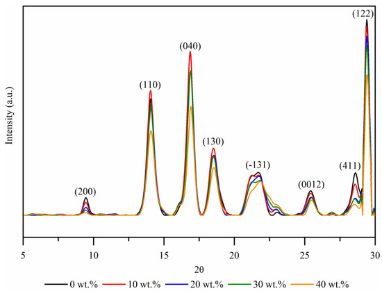 Figure 7 shows the XRD diffraction patterns in the 2θ angle range of the RPP matrix composites as a function of wood fiber concentration. The diffraction peaks of composites with RPP matrix are positioned at 2θ angles of 9.38° (200), 14.04° (110), 16.87° (040), 18.52° (130), 21.84° (−131), 25.43° (0012), 28.61° (411), and 29.40° (3.03).