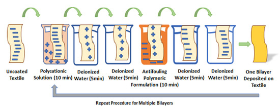 The pretreated cotton textile was cut into swatches of 75 by 25 mm. Negatively charged cotton swatches were first dipped in PDAC (a polycation solution maintained at neutral pH) for 10 min, resulting in positive charge deposition (single ion layer) followed by subsequent washing with deionized water twice for 5 min in two separate beakers to achieve the uniform deposition of charges, and to remove unbound or loosely attached molecules from the textile surface. For the opposite charge of another single ion layer, cotton swatches were dipped in an antifouling polymeric formulation (APF maintained at neutral pH) for 10 min, followed by washing with deionized water twice for 5 min in two separate beakers. Thus, a bilayer (1bL) of oppositely charged ions was formed due to electrostatic interaction on the cotton textile between the positively charged polyelectrolyte and negatively charged antifouling polymeric formulation (APF). The whole process of fabricating a single bilayer was accomplished in 40 min. The same procedure was repeated to cyclically fabricate 5, 10, 15, and 20 bilayers without the textile drying in each step. Fabricated textiles with top layers of negatively charged APF were considered for the slow release of antifouling functionality and characterized for an in vitro antibacterial test. The schematic representation of the layer-by-layer coating of the cotton textile is given in Figure 2.