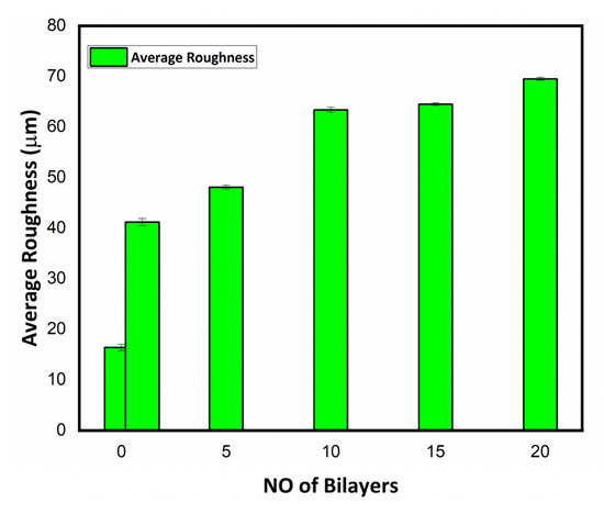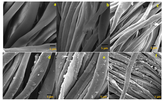 The surface morphology of layer-by-layer-deposited thin films of antifouling polymeric (APF) coating was studied by observing the SEM micrographs. Cross-sectional views of SEM micrographs showed the surface morphology of the uncoated and coated cotton textiles, as given in Figure 4. The smooth and uniform surface of the uncoated mercerized cotton textile fabric is shown in Figure 4a, while a significant increase in roughness in the morphology of the coated textile appeared after coating 1 bilayer up to 20 bilayers as shown in Figure 4b–f. The multilayer coating of polyelectrolytes over the cotton textile surface produced an agglomeration [34]. The density of agglomerates increased with the sequential adsorption of the number of bilayers. SEM micrographs of the coated textile fabric showed the uniform and homogeneous deposition of nanoparticles over the surface. There were fewer agglomerates with the coating of 1 and 5 bilayers, as shown in Figure 4b,c, as compared with the coated textile fabric with 10, 15, and 20 bilayers, as shown in Figure 4d–f, with a subsequent increase in the population of agglomerates. The less and dense agglomeration of charged particles over the textile surface depends upon various factors, including the nature and concentration of the polyelectrolyte solution (cationic or anionic polyelectrolyte), immersion time in deionized water, polyelectrolytes, and nanoformulations, besides the cyclical drying process in each step [35]. The roughened surface of the fabricate textile fabric after subsequent bilayer coating potentially created hydrophobicity and antifouling activity [36].