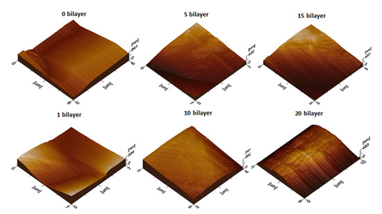 Atomic force microscopy (AFM) images of uncoated (0 BL) and coated cotton textile (1, 5, 10, 15, and 20 BL).