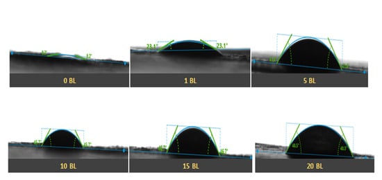 Contact angle measurement of 0, 1, 5, 10, 15, and 20 BL coated cotton textile.