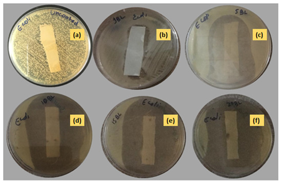Antibacterial activity of (a) uncoated and coated in (b) 1 BL, (c) 5 BL, (d) 10 BL, (e) 15 BL, and (f) 20 BL against Escherichia coli.