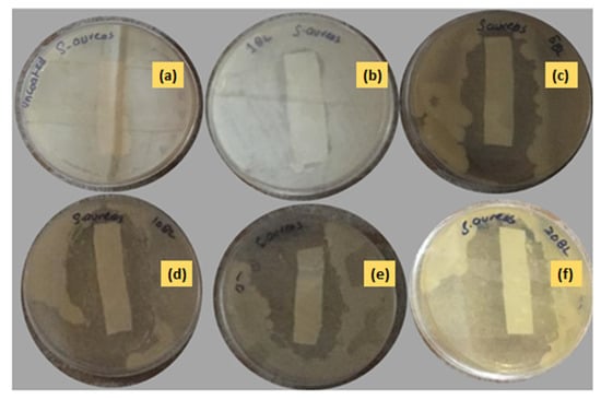 Antibacterial activity of (a) uncoated and coated in (b) 1 BL, (c) 5 BL, (d) 10 BL, (e) 15 BL, and (f) 20 BL textiles against Staphylococcus aureus.
