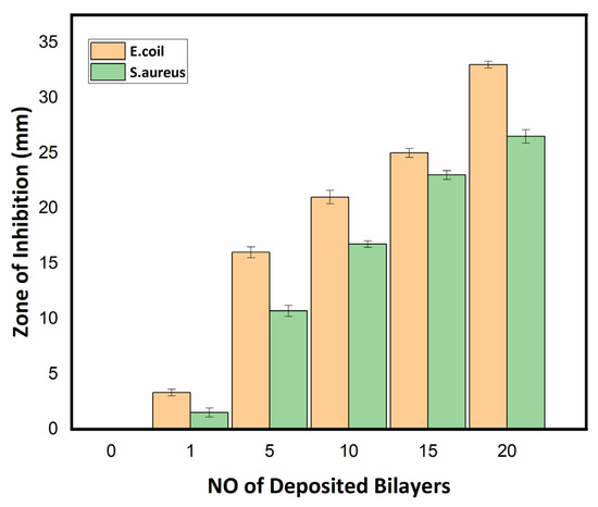 The antibacterial activity of the uncoated and nanoencapsulated finished cotton textiles was established against two bacterial strains, Gram-positive S. aureus and Gram-negative E. coli, by using a qualitative agar disk diffusion assay [49]. The antibacterial test results of the uncoated and coated textile fabrics against E. coli and S. aureus are shown in Figure 10 and Figure 11 respectively. The uncoated textile was taken as a control against both strains to compare the antibacterial efficacy of the nanoencapsulated finished cotton textile fabricated with the layer-by-layer coating of the antifouling polymeric formulation (APF). The antibacterial efficacy of fabricated finished textile was analyzed by placing the textile swatches (40 × 10 mm) in intimate contact on agar plates prestreaked with bacterial inoculum [50]. A clear zone of inhibition was observed around the modified textiles coated with 1, 5, 10, 15, and 20 bilayers. The zone of inhibition against both strains progressively increased around the textile swatches fabricated with a progressive coating of bilayers. These results were attributed to the significant release of antifouling functional drugs from the polymeric nanoencapsulated finished textile in a concentration-dependent manner [31,51]. The release of antifouling drug cefotaxime from APF was responsible for the antifouling activity of the fabricated textiles. The antibacterial activity of the fabricated textiles was further compared against both strains with a greater zone of inhibition against E. coli as compared to S. aureus, as shown in Figure 12. Thin-walled Gram-negative E. coli was more susceptible to bactericidal action than Gram-positive S. aureus was. Moreover, there was electrostatic repulsion between Gram-negative E. coli and the negatively charged layer of the antifouling polymeric formulation (APF) coated on the textile [52]. The antifouling activity of the nanoencapsulated finished textile fabric was attributed to the slow release of cefotaxime encapsulated inside the PCL shell. As the number of deposited bilayers increased, antifouling activity increased due to the increased release of cefotaxime form PCL nanoparticles. Thus, the antifouling polymeric formulation (APF) encapsulated nanoparticles of cefotaxime, as a notable antibacterial moiety has significant bactericidal action attributed to the high stability of beta-lactamase enzymes, thus inhibiting the synthesis of bacterial cell walls. It has significant bactericidal action against Gram-negative bacterial strains, while it is associated with adequate action towards Gram-positive bacteria [53].