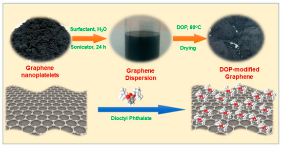 Fabricating process of the dioctyl phthalate-modified graphene nanoplatelets.