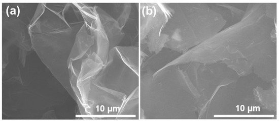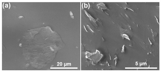 The surface morphologies of the graphene nanoplatelets before and after modification with the DOP were observed by scanning electron microscopy, and the results are shown in Figure 2. The pristine graphene nanoplatelets show a wrinkle and crumpled appearance with a lateral diameter ranging from 10–30 µm (provided by the supplier) (Figure 2a). The graphene sheets were vertically semi-transparent to the electron beam of the SEM instrument, which indicated that the GNPs consist of about 30–40 layers of single graphene sheets (equivalent to the thickness of approximately 10 to 20 nm) [38]. After modification with the dioctyl phthalate, the GNPs’ surface becomes smoother and thicker (Figure 2b). It can also be observed that the DOP-modified GNPs’ surface was not semi-transparent to the electron beam, indicating that the DOP successfully covered all the surfaces of GNPs.