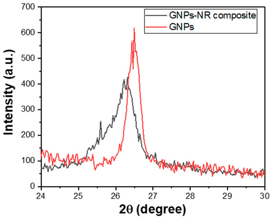 The crystallinity of the modified GNPs and the modified GNPs/NR composite was investigated by X-ray diffraction, as shown in Figure 4. As shown in Figure S1, the XRD pattern shows the amorphous nature of the dioctyl phthalate and the GNPs are of graphitic nature with a strong diffraction peak at around 26.6°. The XRD pattern of the modified GNPs consists of the broad peak at 26.6° with significantly decreased peak intensity, which is typical for the characteristic peak of the graphitic compound in the form of graphene multilayers [39]. When the modified GNPs were integrated into the became matrix, the diffraction peak of the GNPs was still observed; however, the peak becomes less sharp with lower intensity and shifted to 26.3°. This demonstrates the good distribution of the modified GNPs in the NR matrix. Additionally, the width of the characteristic peak of the GNPs in the NR matrix was wider than that of the modified GNPs, indicating the modified GNPs were uniformly covered with rubber matrix.
