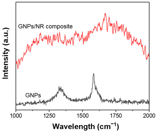 The Raman spectroscopy analysis excited at 663 nm was further employed to investigate the nature of the pristine GNPs and the modified GNPs in the NR matrix (Figure 5). The GNPs’ Raman spectrum shows two characteristic peaks at around 1340 and 1585 cm−1 corresponding to the D and G bands of the defects in the carbon network and sp2 C-H bonds in the graphene structure, respectively [40]. The D band peak is significantly broader and lower than the G band, indicating that the GNPs have few defects and low oxygen-containing groups on the surface. For the Raman spectrum of the GNPs-reinforced NR composite, the G band peak shifts to the wavelength of around 1620 cm−1, demonstrating the excellent interaction between the modified GNPs with the NR rubber. Furthermore, the intensity of the D and G bands of the GNPs in the NR matrix greatly decreased as a probe of uniformly covering the GNPs’ surface with the NR rubber. These results indicate that upon modification of the GNPs with the DOP compound, the distribution of the GNPs in the rubber significantly improves, and as a result, enhances the physic mechanical properties of the rubber composite.