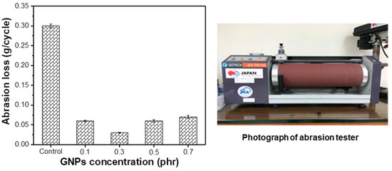 The graphene nanoplatelets with high stiffness, good modulus, and substantial surface area have been extensively utilized as a filler to enhance the mechanical properties of the rubber [41]. One of the most studied applications of graphene used as filler in the rubber composite is to improve the abrasion resistance of the composite [16,42]. Figure 6 shows the abrasion weight loss of the rubber without GNPs and reinforced with the GNPs. Without the presence of the GNPs, the abrasion weight loss is determined to be approximately 0.3 g/cycle. Upon the addition of the modified GNPs, the abrasion weight loss is significantly decreased. The GNPs/NR composite weight only reduces by about 0.063 g for each cycle of the abrasive testing with the GNPs fraction of 0.1 phr. When 0.3 phr of the GNPs was added into the composite, only 0.03 g of the rubber composite was lost for each cycle of testing, which accounts for about a 1000% increase in the abrasion resistance of the NR rubber reinforced with the graphene. Further increases in the GNPs’ concentrations leads to the increase in the abrasion loss of the rubber composite with the value of about 0.06 and 0.074 g/cycle for 0.5 and 0.7 phr GNPs, respectively. The decrease in the abrasion resistance at a high GNPs’ contents is ascribed to the aggregation of the GNPs, leading to a low distribution degree of the graphene in the NR matrix. The abrasion loss at the loading of 0.3 phr was employed to compare the performance of the pristine GNPs and modified GNPs and the result is shown in Figure S3. It can be clearly seen that the abrasion loss for the GNPs/NR composite significantly increased after modification with the dioctyl phthalate. This is attributed to the improvement in the GNPs’ dispersion after DOP modification in the natural rubber’s matrix.