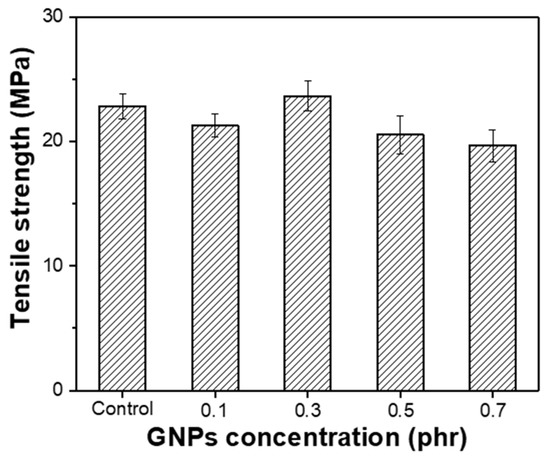 The effect of the GNPs on the tensile strength of the NR composite was also investigated, and the results are shown in Figure 8. It can be clearly observed that the addition of the modified GNPs into the NR matrix negligibly affects the tensile strength of the composite. At a GNP concentration of 0.3 phr, only about 5% of the tensile strength increases compared to the control sample. At a further increase in the GNPs contents, the tensile strength decreases. This phenomenon might be due to the increase in the GNP contents, leading to the aggregation of graphene flakes; as a result, the graphene surface was not uniformly covered by the NR rubber. Figure S5 shows the comparative results in tensile strength of the GNPs/NR rubber reinforced with pristine GNPs and modified GNPs at the loading of 0.3 phr. It can be clearly observed that the modification of GNPs with DOP decreases the tensile strength of the rubber composite compared to that of pristine GNPs.