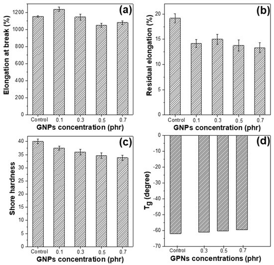 (a) Elongation at break, (b) Residual elongation, (c) Shore hardness, and (d) Glass transmission temperature of the control sample and the DOP-modified GNPs/NR rubber composites with various graphene contents.