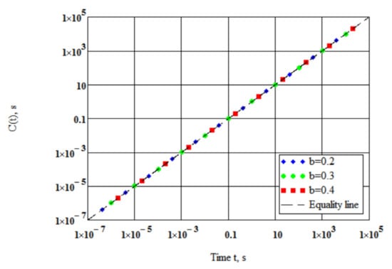 The convolution product of Equation (4) was calculated using Equations (1) and (2) at s for = 0.2, 0.3, and 0.4. The results plotted in Figure 1 numerically confirm that the expressions (1) and (2) for relaxation modulus and creep compliance match each other.