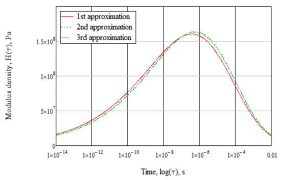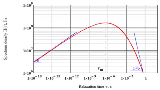 Calculated spectrum densities at the modal relaxation time τm = 1/ωm = 1 s using Equation (11) and the parameters given in Table 2 are presented in Figure 9. The curves in Figure 8 and Figure 9 look very similar with allowance for approximations in the derivation of Equations (11) and (25).