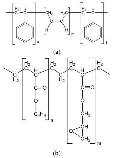 Elvaloy 4170 is a chemically active copolymer of ethylene (71%) with butyl acrylate (20%) and glycidyl methacrylate (9%). Butanol NS 198 is a cationic, high molecular weight styrene butadiene dispersion designed for use in asphalt modification and waterproofing. The content of solid polymers in Butanol is 64%. SBS L 30-01 A represents a linear block for copolymer of styrene (30%) and butadiene (70%). The molecular weights of the polymers Elvaloy and Butanol are in the range of 60,000–80,000 and 80,000–90,000, respectively. The structural formulas of SBS and Elvaloy polymers are shown in Figure 4.