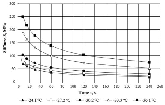 The binders were tested at low temperatures (−18 °C, −24 °C, −27 °C, −30 °C, −33 °C, and −36 °C) on the ATS Bending Beam Rheometer (BBR) according to the standard ASTM D 6648.